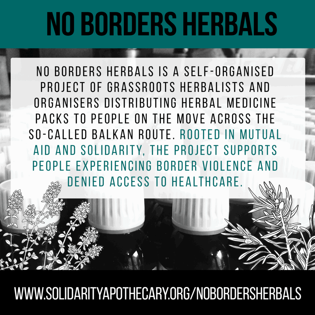 The other project I’ve been stoked to support is No Borders Herbals. NBH is a self-organised project of grassroots herbalists and organisers distributing herbal medicine packs to people on the move along the Balkan route. Rooted in mutual aid and solidarity, the project supports people facing border violence and denied access to healthcare.