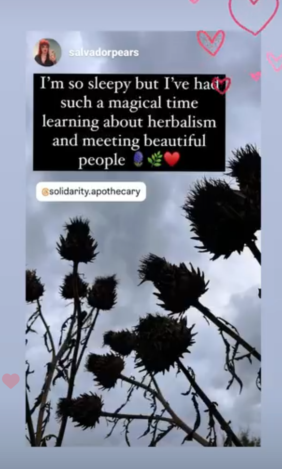 "I cant recommend learning with Nicole enough. She has an extraordinary depth of knowledge which comes from deeply lived experience and a place of really profound compassion and radical care. All this comes together in a learning environment which is really really supportive, unjudgemental, and rich with information, tips, insights, jokes, experience, stories. She is a generous and warm and gracious teacher, and it really felt both enabling and a privilege to participate in her work. Working with Nicole and engaging in her work as the Solidarity Apothecary feels like one of the lessons I’ve needed in our connections and capacities with plants and one another."
