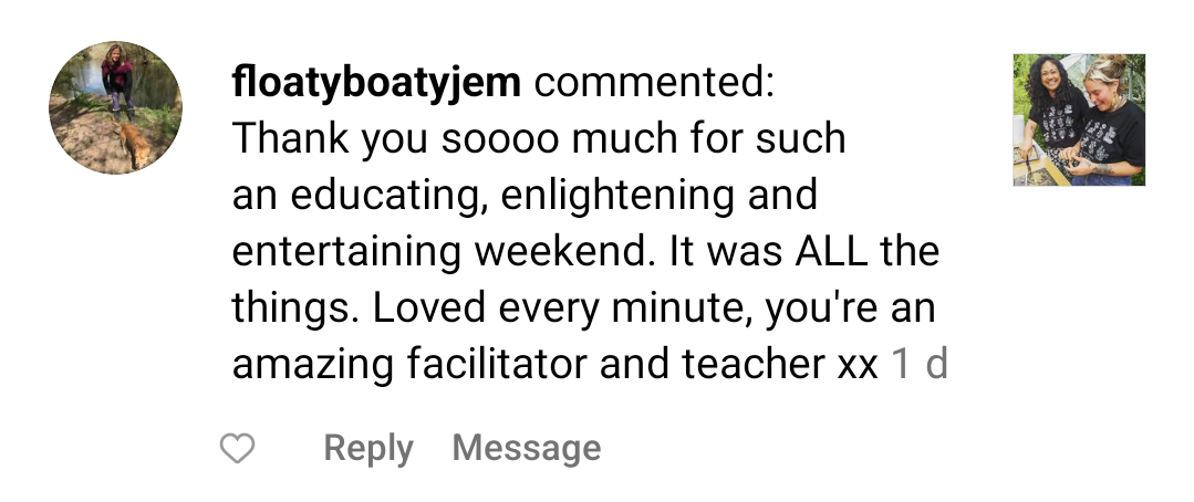 "This was such an informative and immersive weekend. The beauty of the land, Nicole’s teaching style and her genuine care for the whole group made for a safe and nourishing learning environment. It’s also a great place to meet and connect with other plant lovers working towards collective liberation. Highly recommend."